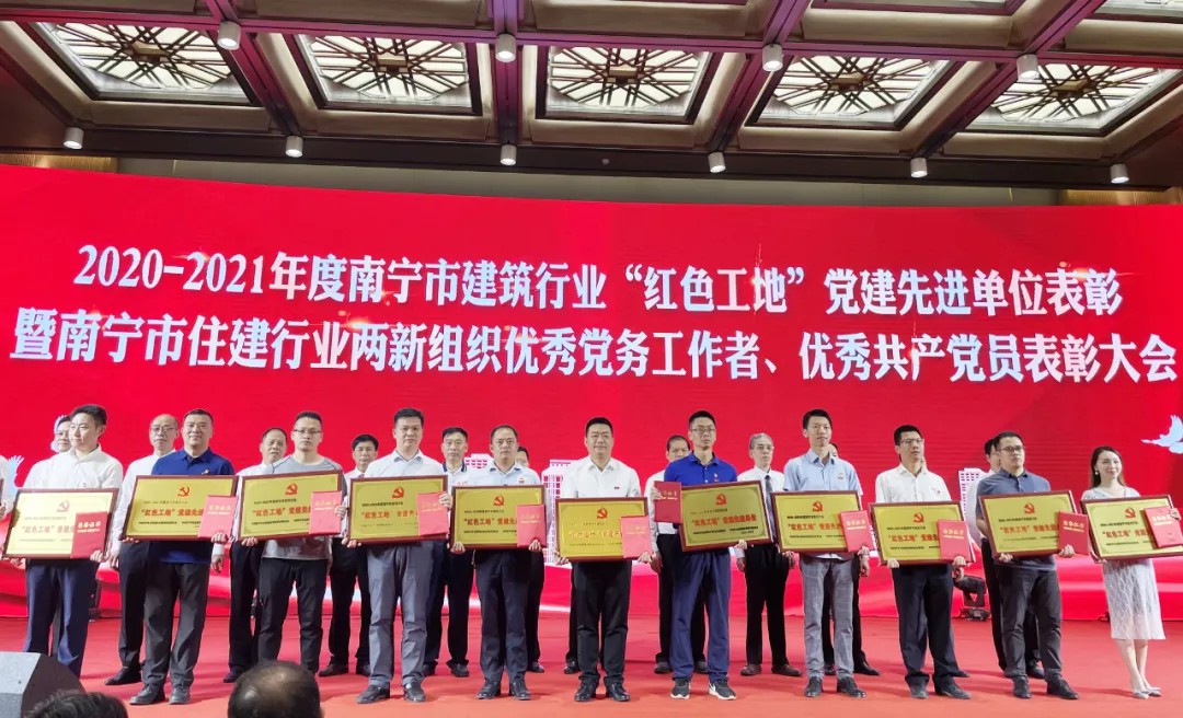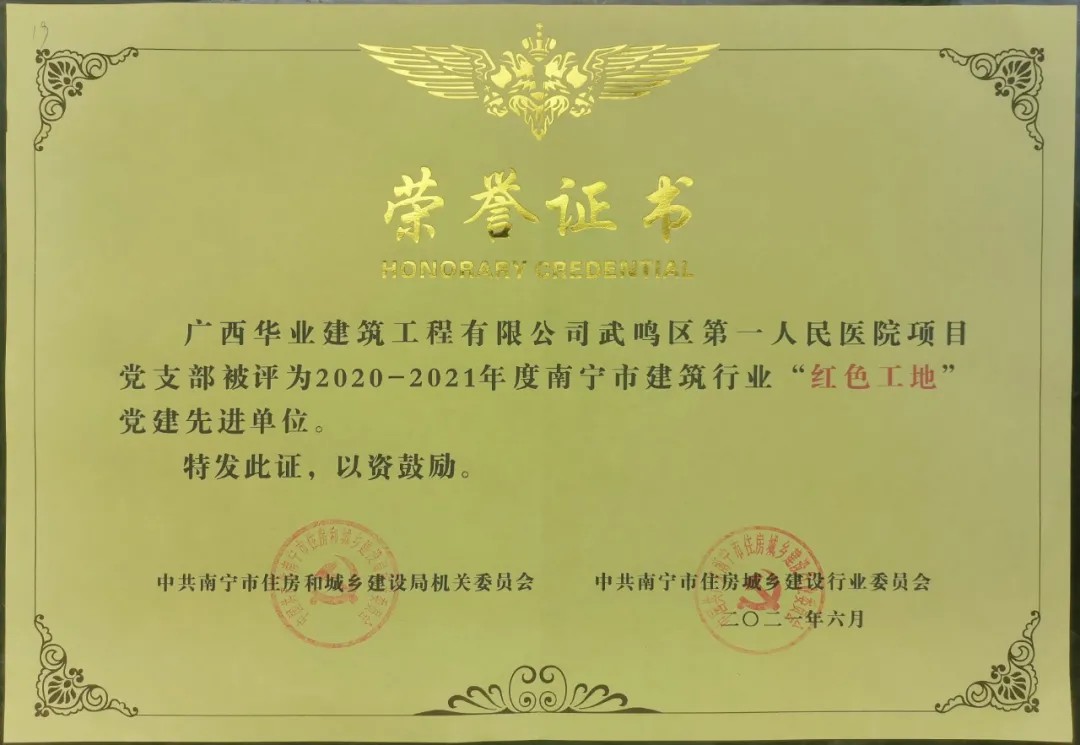 2021年6月29日,在建黨百年華誕到來之際,南寧市建筑業(yè)聯(lián)合會成立30周年紀念大會、南寧市住房和城鄉(xiāng)建設(shè)行業(yè)黨委“七一”表彰大會暨南寧市住建行業(yè)慶祝中國共產(chǎn)黨成立100周年文藝演出在南寧隆重舉行。華業(yè)集團武鳴區(qū)第一人民醫(yī)院項目黨支部和廣西第二看守所改擴建項目黨支部榮獲2020—2021年度南寧市住建行業(yè)“紅色工地”黨建先進單位,其中武鳴項目黨支部是此次表彰的眾多黨建先進單位中唯一入選的民營企業(yè)“紅色工地”標桿項目。